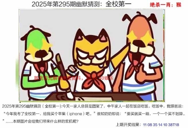 第295期幽默猜测(全校第一)【开:牛05】 今天一家人总算是团聚了,中午家人一起在饭店吃饭。吃饭中,我跟爸说:“今年我考了全校第一,给我买个苹果(iphone)吧。”谁知奶奶却说:“要买就买一箱,一个一个买不划算。”..本期图片会给我们带来什么样的玄机呢? 幽默猜肖:鼠羊鸡牛蛇马 |